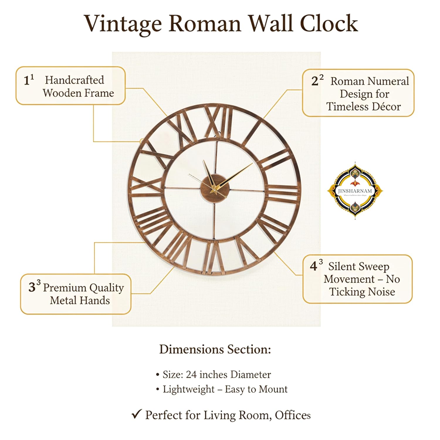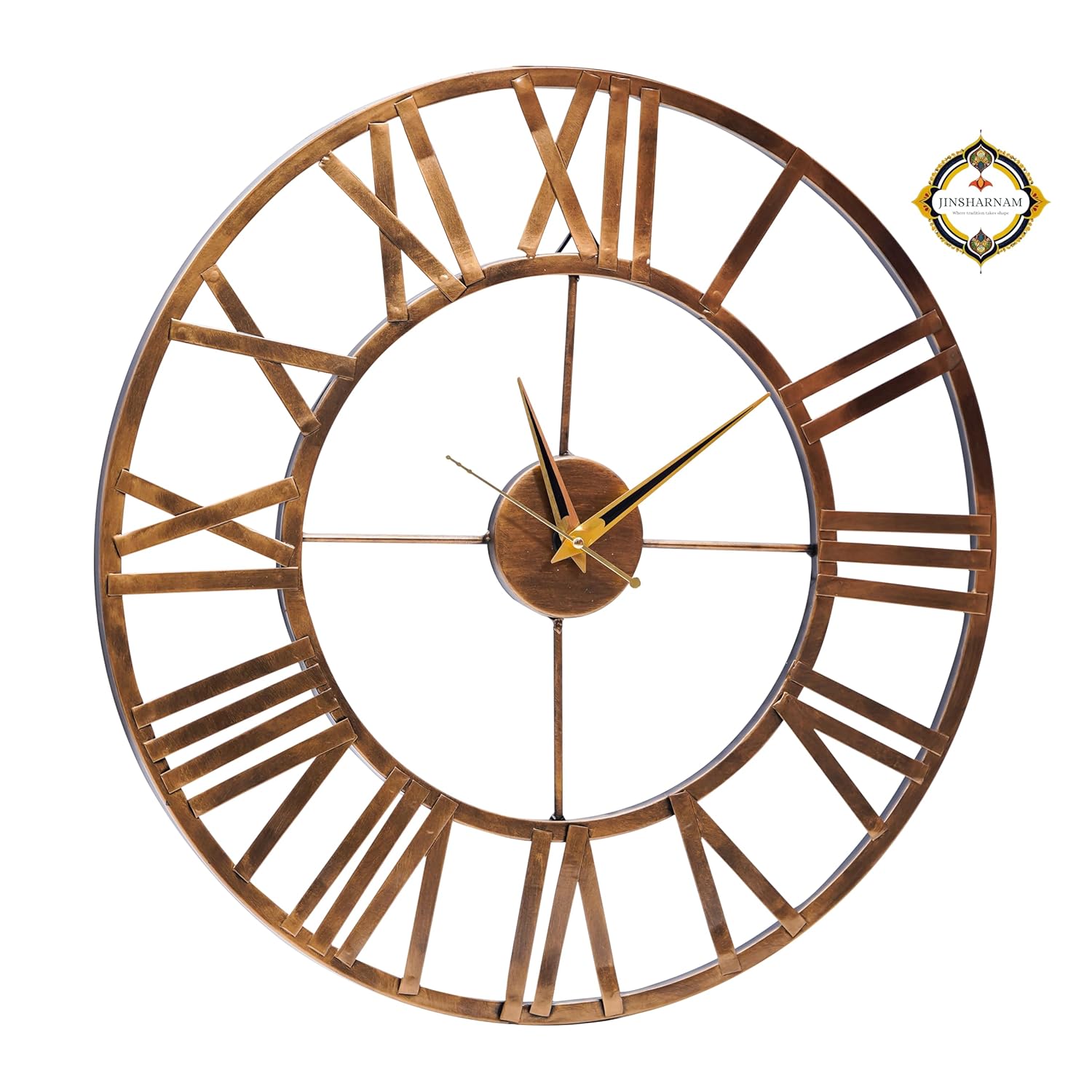 Jinsharnam Analog 54 cm X 54 cm Add a touch of vintage charm to your walls with this Metal Brown Roman Wall Clock. Crafted with precision from high-quality metal, this clock blends classic design with modern elegance. The bold Roman numerals enhance its antique appeal, while the silent sweep movement ensures a peaceful ambiance.Whether placed in your living room, study, or office, it serves as both a functional timepiece and a decorative art piece. An ideal choice for those who appreciate fine craftsmanship and stylish décorWall Clock